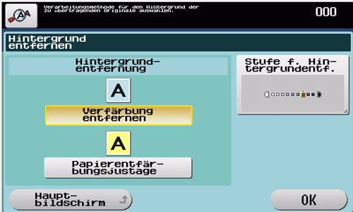[Stufe f. Hintergrundentf.] | Tippen Sie auf diese Taste, um die Dichte der Hintergrundfarbe für ein Original mit farbigem Hintergrund anzupassen. Bei Auswahl von [Auto] wird die Hintergrundfarbe automatisch bestimmt und ein Original mit der optimalen Hintergrunddichte gescannt. |