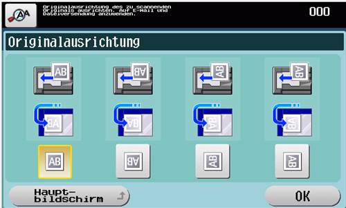 Tippen Sie auf [Scaneinstellungen] - [Originaleinst.] - [Originalausrichtung], um die Originalausrichtung auszuwählen.
