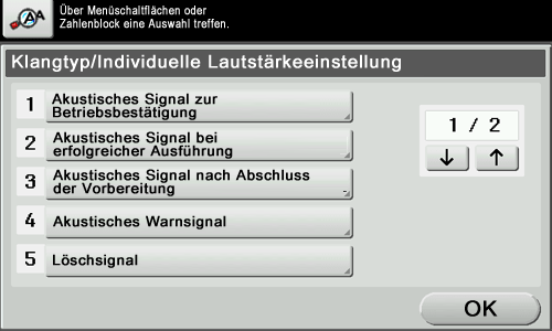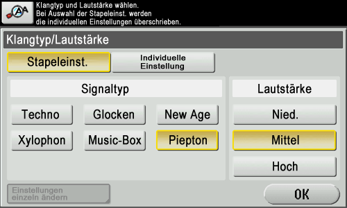 [Klangtyp/Lautstärke] | Legen Sie den Typ und die Lautstärke für die folgenden Signale fest: [Akustisches Signal zur Betriebsbestätigung], [Akustisches Signal bei erfolgreicher Ausführung], [Akustisches Signal nach Abschluss der Vorbereitung], [Akustisches Warnsignal], [Löschsignal] und [Authentifizierungssignal]. Bei Auswahl von [Stapeleinst.] werden alle Signaltypen und die entsprechende Lautstärke gemeinsam eingerichtet. Wählen Sie den Signaltyp aus sechs verfügbaren Typen aus und setzen Sie die Signallautstärke auf [Hoch], [Mittel] oder [Nied.]. Bei Auswahl von [Individuelle Einstellung] werden alle Signaltypen und die entsprechende Lautstärke getrennt eingerichtet. |