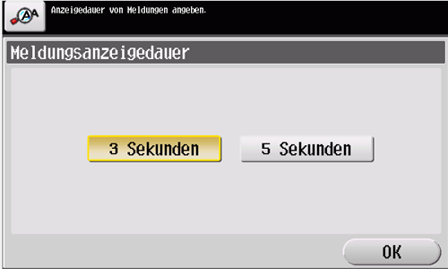 Tippen Sie auf [Voreinstellung] - [Meldungsanzeigedauer] und wählen Sie [3 Sekunden] oder [5 Sekunden] (Standard: [3 Sekunden]).