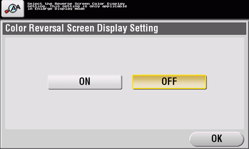 Tippen Sie auf [Displayvoreinstellung] - [Anzeigeeinstellung für den Farbumkehr-Bildschirm] und legen Sie dann fest, ob die Anzeigefarbe des Bildschirms umgekehrt werden soll (Standard: [AUS]).
