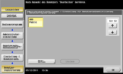 Wählen Sie [Benutzerauthentifizierung/Kostenstelle] - [Einstellung f. Benutzerauth.] - [Benutzerregistrierung] aus.