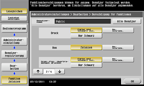 Wählen Sie unter [Druck] die Option [Farbe und Schwarz zul.] oder [Nur Schwarz] aus und tippen Sie dann auf [OK].