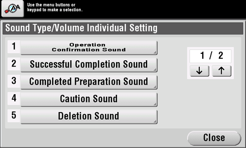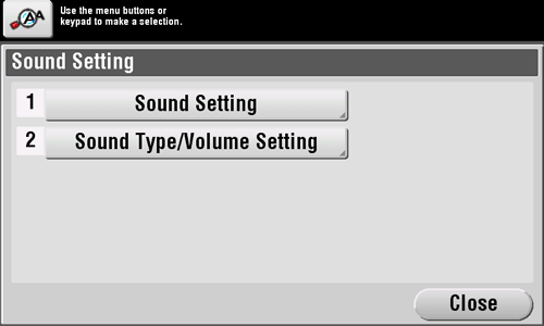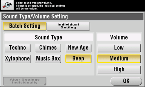 [Sound Type/Volume Setting] | Specify the sound type and volume for each of [Operation Confirmation Sound], [Successful Completion Sound], [Completed Preparation Sound], [Caution Sound], [Deletion Sound], and [Authentication Sound]. When [Batch Setting] is selected, all the sound type and volume will be set at once. Select the sound type from six types and select the sound volume from [High][Medium][Low] for adjustment. When [Individual Setting] is selected, all the sound type and volume will be set separately. |