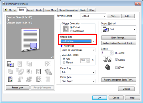 In [Original Size] or [Paper Size] on the [Basic] tab, select [Custom Size].