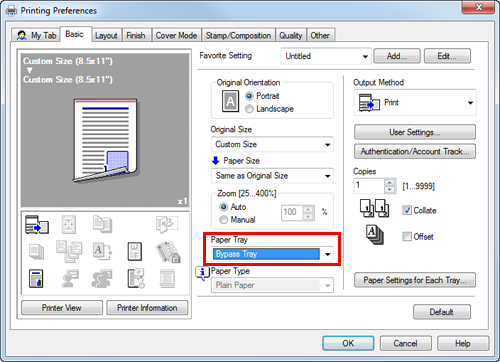 If the paper setting of [Bypass Tray] in this machine is the same as that of [Original Size] in step 3 or [Paper Type] in step 7, printing starts without further setting.