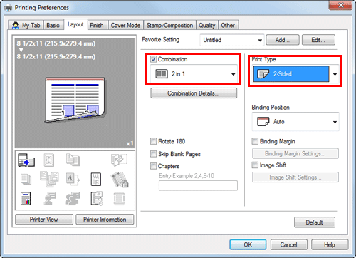 Setting black-and-white printing and 2-sided printing as initial values helps save toner and paper.