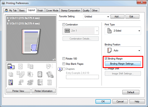 To configure the page margin, select the [Binding Margin] check box on the [Layout] tab and click [Binding Margin Settings].