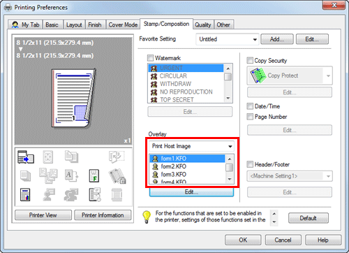 To print a document over an output of a file created on a computer, select [Print Host Image] from [Overlay] on the [Stamp/Composition] tab, then select the file for overlay printing.