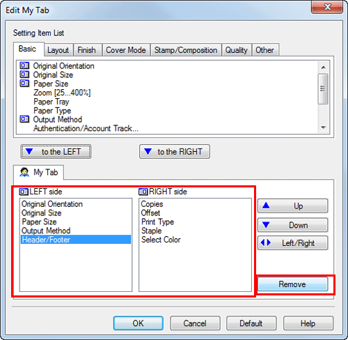 To register functions on My Tab, select the functions to register from [Setting Item List] and click [to the LEFT] or [to the RIGHT].