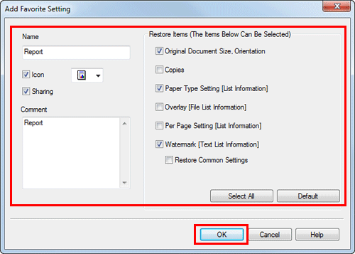 [Restore Items] | Select the box of each item to be reflected on the settings on the properties window when the favorite setting is restored. |