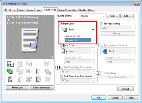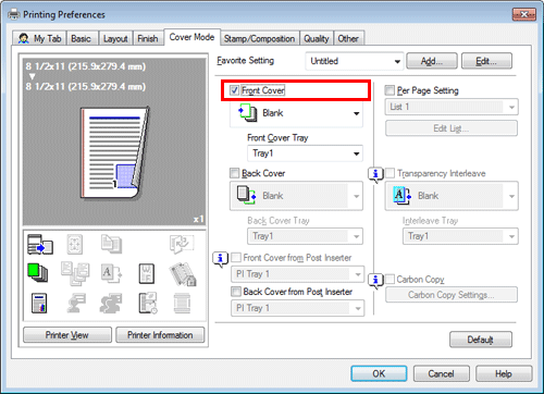 To print the cover on a different type of paper, select the [Front Cover] check box on the [Cover Mode] tab.