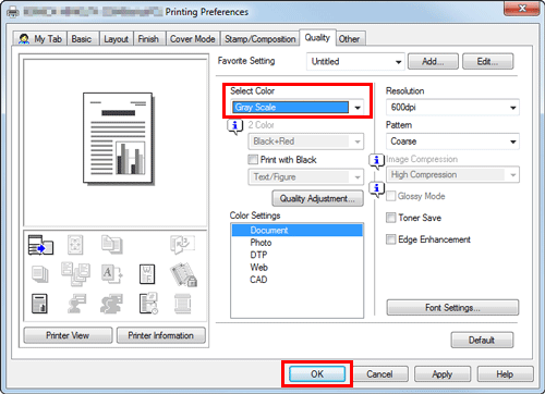 Select [Gray Scale] from [Select Color] on the [Quality] tab, then click [OK].