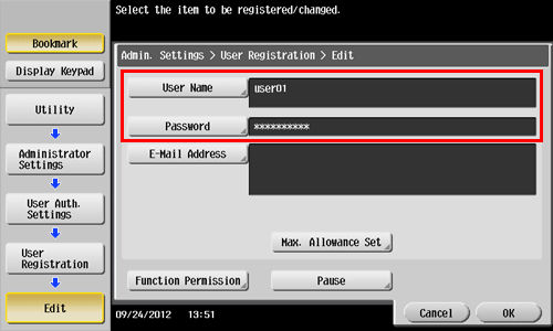 Tap [Max. Allowance Set] and [Color] or [Black], then enter the maximum allowance for the number of color/black originals that the user can print, using the Keypad.