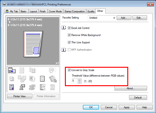 En la ficha [Otros], seleccione la casilla de verificación [Convertir a escala de grises] y establezca el umbral (los valores RGB diferenciales que deben convertirse a escala de grises).