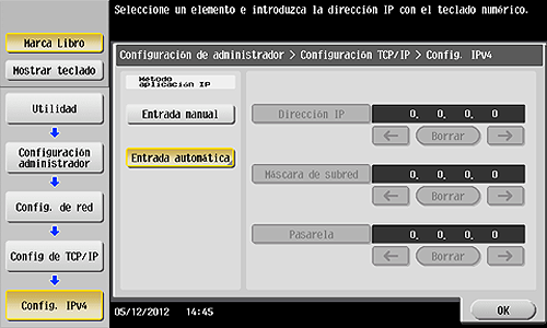 En el Panel de control, pulse [Utilidad] - [Config de Admin] - [Config de red] - [Config de TCP/IP] - [Config. IPv4] y, a continuación, configure el siguiente ajuste.