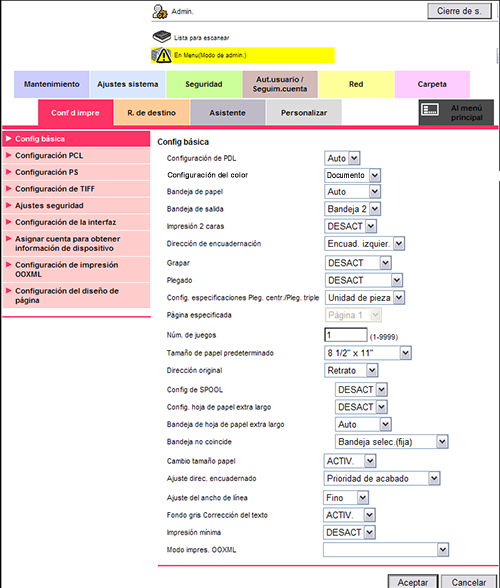 En el modo Administrador, seleccione [Config. impresión] - [Config básica] y, a continuación, configure las siguientes opciones.