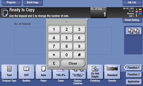 [10 teclado] | Toque este botón para visualizar el teclado del panel táctil al introducir valores numéricos como el número de copias o el porcentaje de zoom. |