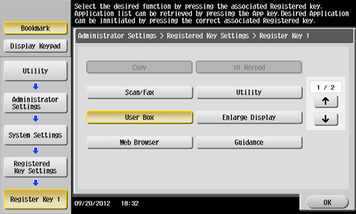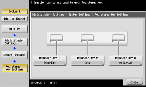 Toque [Utilidad] - [Config de Admin] - [Ajustes sistema] - [Config. teclas registradas] - [Tecla Registrar 1].