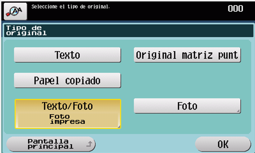 [Texto] | Toque este botón para escanear un original, que conste principalmente de texto, al nivel óptimo de calidad de imagen. Esta función acentúa los bordes de cada carácter, lo que da lugar a imágenes fáciles de leer. |