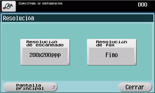 [Resolución de escaneado] | Seleccione la resolución del original para la transmisión de escaneado. Para utilizar Transmisión de correo electrónico, Transmisión SMB, Transmisión FTP, Transmisión WebDAV o Guardar en carpeta de usuario, se selecciona la siguiente resolución para escanear el original.