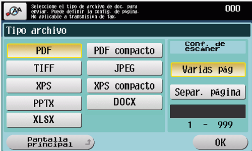 Los tipos de archivo disponibles son PDF, TIFF, JPEG, XPS, PPTX, DOCX, XLSX y otros tipos. Para almacenar datos importantes del original debe utilizarse el formato de archivo PDF cifrado con contraseña.
