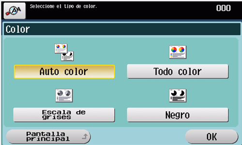 [Auto color] | Al escanear un original seleccione esta opción para determinar automáticamente [Todo color] o [Escala de grises] de acuerdo con el color de dicho original. |