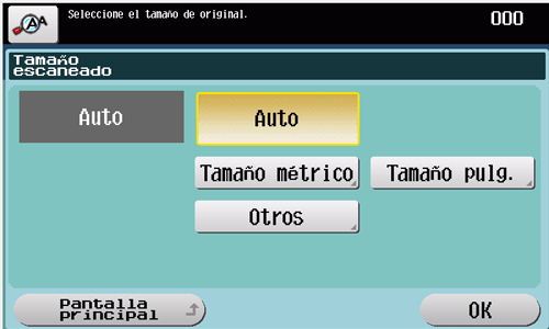 Hay varios tamaños de escaneado, por ejemplo, [Auto] que iguala el mismo del original, [Tamaño métrico] y [Tamaño pulg.].
