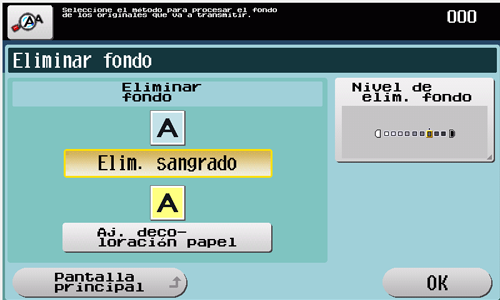[Nivel de elim. fondo] | Toque este botón para ajustar la densidad del color de fondo para un original con un fondo en color. Seleccionando [Auto] se determinará automáticamente la densidad del color de fondo y se escaneará el original al nivel óptimo de densidad de fondo. |