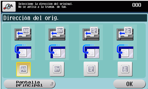 Toque [Config. escaneado] - [Configuración del original] - [Dirección del orig.] para seleccionar la dirección de carga del original.
