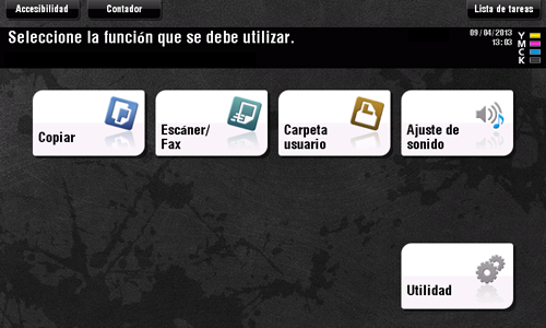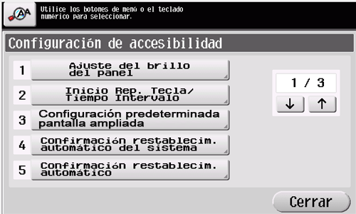 [Accesibilidad] está disponible al configurar el entorno operativo del panel de control, por ejemplo, al ajustar una posición para pulsar el panel táctil o al cambiar los sonidos de las teclas.