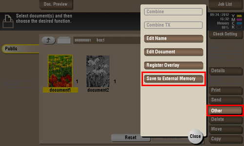 Para guardar un archivo en un dispositivo de memoria externa, seleccione el archivo que se va a guardar, toque [Otros] y, a continuación, [Guardar en memoria ext.].