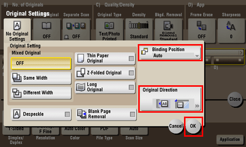 Defina [Pos. encuadernado] y [Dirección de original] en función del original de 2 caras cargado y, a continuación, toque [Aceptar].