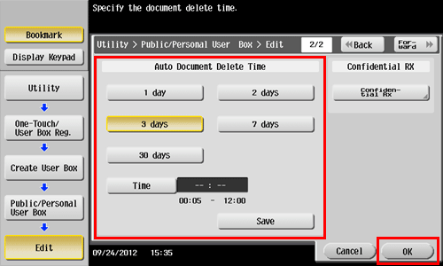Seleccione una carpeta de usuario sujeta a la configuración del periodo de retención de archivos y, a continuación, toque [Editar].