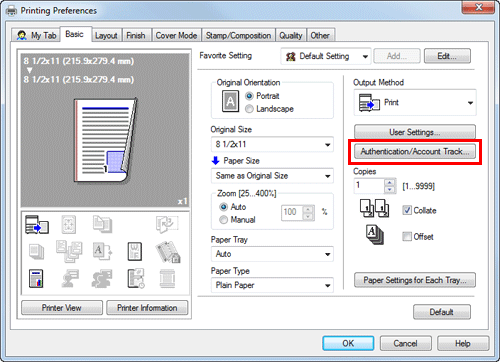 Configure con antelación la autenticación de usuario en la opción Config de Admin de esta máquina y en la ventana de propiedades del controlador de impresora. Para obtener más información sobre los ajustes de autenticación de usuario de la máquina, consulte Aquí. Para obtener más información sobre los ajustes de autenticación de usuario del controlador de impresora, consulte Aquí.