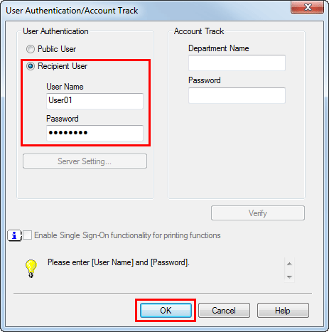 Seleccione [Usuario destinatario], introduzca el [Nombre de usuario] y la [Contraseña] registrados con la máquina y, a continuación, haga clic en [Aceptar].