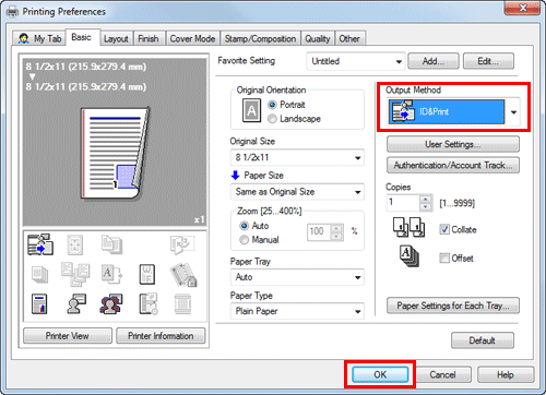 Seleccione [ID e imprimir] en [Método de salida] y, a continuación, haga clic en [Aceptar].