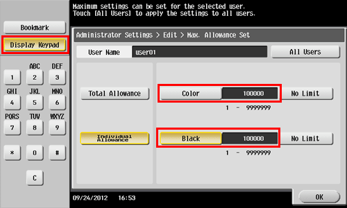 Toque [Ajuste permiso máx] y [Color] o [Negro] y, a continuación, introduzca el permiso máximo del número de originales en color/negro que el usuario puede imprimir, utilizando el teclado.