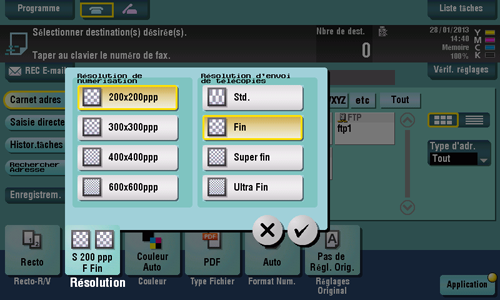 [Résolution de numérisation] | Sélectionnez la définition de l'original pour la transmission de l'image numérisée. Lorsque vous utilisez la fonction Scan vers E‑mail, SMB Send, FTP Send, WebDAV Send ou Enreg. dans Boîte, sélectionnez la résolution suivante pour numériser un original.