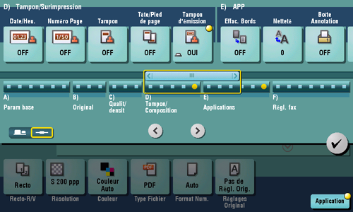 Sélectionnez la position et la représentation des tampons et ajoutez la date et l'heure à laquelle l'original est numérisé. La date et l'heure peuvent être imprimées sur toutes les pages ou uniquement sur la première page.