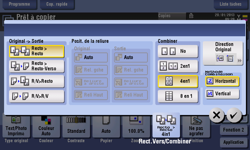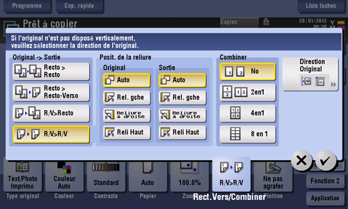 [Original > Sortie] | Sélectionnez une combinaison de l'original à charger (original recto ou original R/V) et la méthode de copie (copie recto ou copie R/V). Si vous avez sélectionné une option autre que [Recto>Recto], spécifiez également [Posit. de la reliure] et [Direction Original]. | |