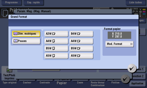 [Modif. param mag] | Si nécessaire, changez les paramètres du format et du type du papier chargé dans le bac papier sélectionné.