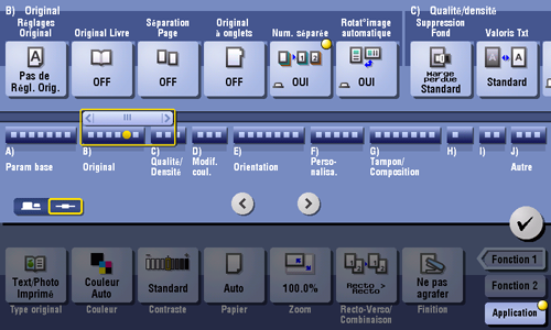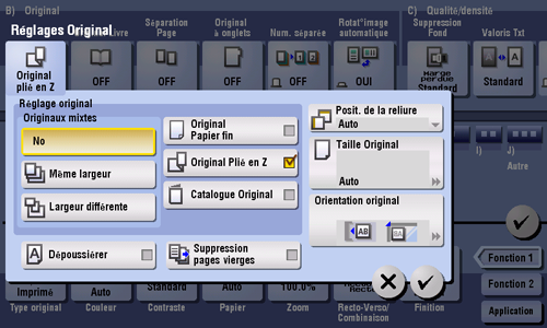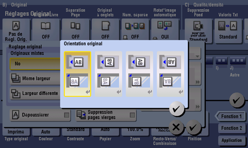 Les originaux sont numérisés avec différents réglages pour chaque jeu et copiés de manière globale. Utilisez cette fonction lorsque plusieurs types d'originaux sont mélangés, par exemple un original recto à imprimer sur une face et un original R/V à copier en l'agrandissant.