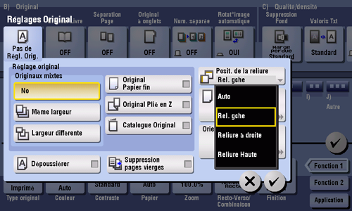 [Rel. gche] | Sélectionnez cette option lorsque la position de reliure est réglée sur la gauche de l'original. |