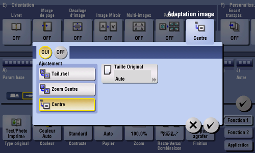 Spécifiez comment disposer l'image de l'original sur le papier. Vous pouvez agrandir une portion de l'original au limites maximales du papier ou disposez l'image de l'original au centre de la page sans l'agrandir.