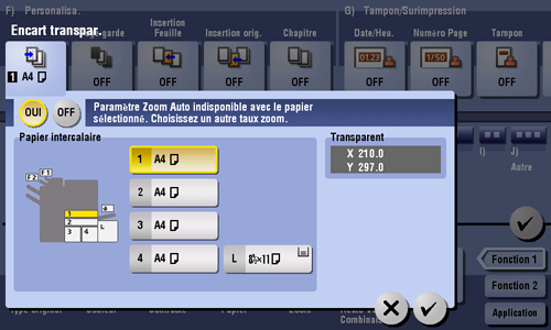 [Papier intercalaire] | Sélectionnez le magasin contenant le papier à insérer entre les transparents. Le format papier pour transparents chargé dans l'introducteur manuel est affiché sous [Transparent]. Veillez à utiliser le même format pour les transparents chargés et le papier à insérer. |