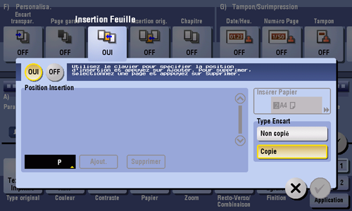 [OUI]/[OFF] | Sélectionnez [OUI] pour spécifier Insertion Feuille. |