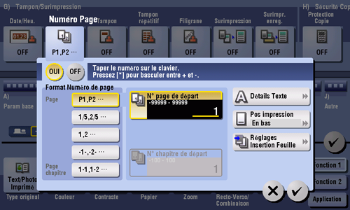 [N° page de départ] | Entrez le numéro de la page de départ à imprimer sur la première page à l'aide du clavier. Pour afficher le clavier, tapez sur la zone de saisie des chiffres. Par exemple, pour imprimer les numéros de page depuis la troisième page, entrez "-1". La première page de l'original est comptée comme "-1", la deuxième page comme "0" et la troisième page est comptée comme "1". Dans [N° page de départ], un numéro de page est imprimé sur les pages 1 et suivantes. Si vous entrez "2", les numéros de page sont imprimés dans l'ordre depuis la première page de l'original sous la forme "2, 3", etc. Le « - » (signe moins) se change en + à chaque fois que vous tapez sur [*]. |