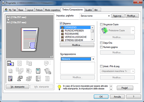 Nella scheda [Timbro/Composizione], selezionare la casella di controllo [Filigrana]. Inoltre, selezionare la filigrana da stampare.