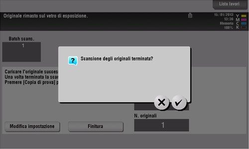 Una volta scansionati tutti gli originali, fare clic su [Finitura] e premere il tasto Avvio.